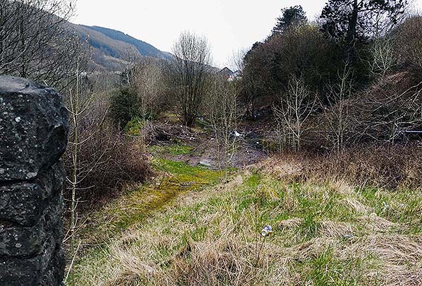 Photo by John Mann The site of the demolished station building at Aberfan c1986. Part of the back wall of the building still remains as does the blocked entrance from Station Hill. Passengers entered through a door in the north west upper corner of the building and came out onto the platform through an arched doorway in the south east corner.Photo by Phil Hudson ![]()
