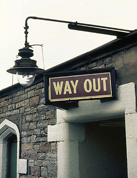 An original North Eastern Railway 'way out' sign still in use at Alston in April 1976.