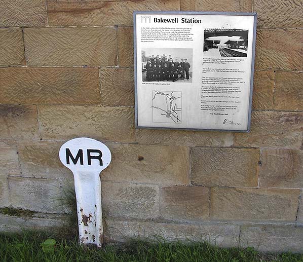 ![]() An original Midland Railway post on the southbound platform at Bakewell Station in August 2008. Next to the post is an interpretive board giving information about the station. Photo by Paul Wright