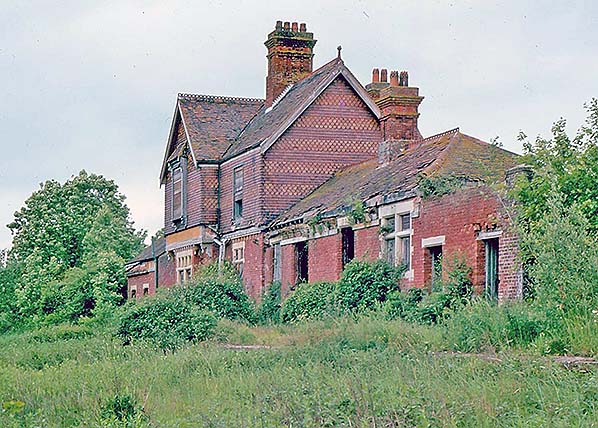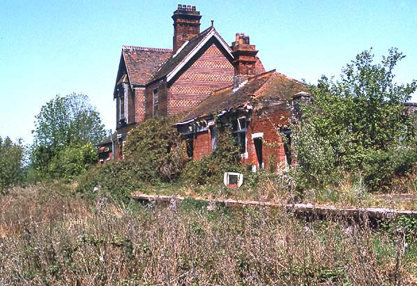 Barcombe station building seen from the overgrown track bed in June 1977. Some damage to the roof is clearly visible.