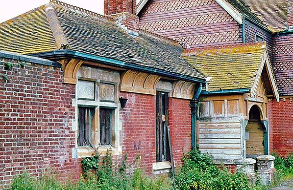 Photo by Alan Young ![]() Detail of the station entrance with its wooden porch in the style of a lychgate in June 1977.