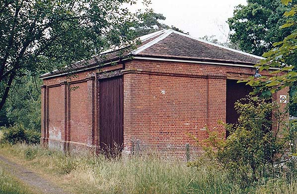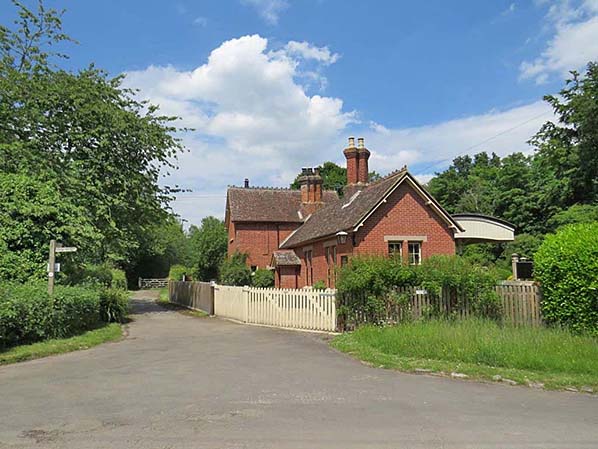 Barnards station seen from Station Road crossroads in June 2022. Baynards Road is to the left, Station Road to the right. Lawns Road is ahead, the gate in the distance is the entrance to the goods yard.
