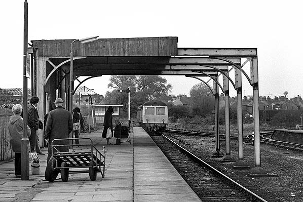A Cravens 2-car DMU from Bletchley, enters Bedford St Johns station in November 1979. A barrow has appeared on the platform; it doesn't appear in any other pictures; perhaps it belongs to a passenger.