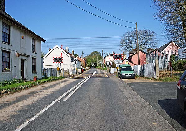 Looking west along Station Road, across the level crossing in October 2015.The station entrance is on the right with the Railway Tavern on the left.