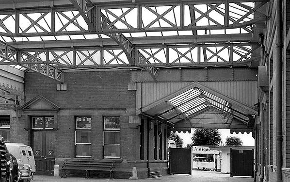 Bexhill West station side entrance between the two buildings seen from the station concourse in 1968. The station refreshment room is seen to the left.