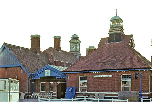 The east side of Bexhill West station c1980. The buildings consisted of two separate blocks with a walkway between them. The only major external alteration to the station is the single-storey brick building, seen here, linking the two original buildings.