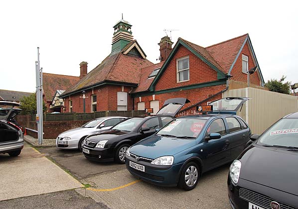 Bexhill West station in November 2013. This building is at right angles to the main station building and separated tom it by and entrance directly onto the concourse. The south end of the building beneath the second turret with an ogee-shaped metal dome was the refreshment room. To its right was the gents’ toilet, porters’ and lamp rooms