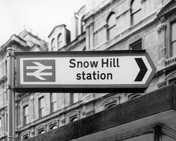 being removed within 12 months. Photo by John Mann Snow Hill prided itself on being an efficient station and clear signage was seen as paramount to this. At the top of the staircase, from the booking hall, to platforms 1 to 6 not only are the destinations served by the platforms listed but which side of the stairs should be used is clearly displayed. Photo by Ian Baker ![]() A Birmingham Snow Hill roundel-format totem from platform 7. This piece of railwayana was purchased for 10 Shillings and removed by a young trainspotter and his friend in 1967 in full view of some bemused passengers on a service to Leamington Spa. The only other station known to have been fitted with such signage was Bristol Temple Meads. Photo by Stephen Burdett from his Invader1009 Flickr photostream ![]() Standard British Rail ‘Corporate Identity’ signage was never fitted at Snow Hill. In its original 1965 form ‘Corporate Identity’ signs were on a plain white board with lettering in the ‘British Rail Alphabet’ devised by Margaret Calvert -inspired by Hoffmann and Miedinger’s ‘Helvetica’ (1957) and an evolution of Calvert’s font produced for NHS hospitals. When the station reopened in 1987 the 1960s/70s style of corporate signs had fallen out of favour and the version installed here has one of several fonts that have appeared in later BR and post-BR time. The new sign proclaims that travellers are arriving at Snow Hill; presumably they should already know that they are in the City of Birmingham. Photo by John Mann