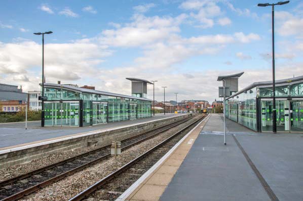 ![]() ![]() Looking north from platform 3 on 5 November 2016 with 172 334 dropping down towards the tunnels with 2V30 Whitlocks End to Kidderminster. Carriage sidings installed for Chriltern Railways can be seen to the left. Photo by Terry Callaghan The new tram stop adjacent to the main station at Snow Hill on 6 December 2016. Despite being called Birmingham Snow Hill there is no direct access to the station with passengers directed to alight at Bull Street tram stop instead, if they are wishing to make a rail connection. Photo by Terry Callaghan To see pictures of Snow Hill signage click here
