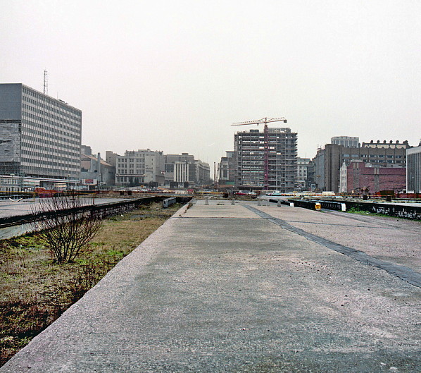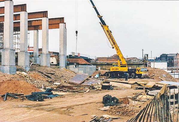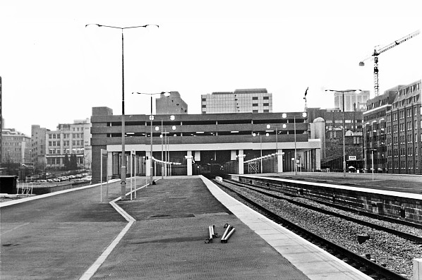 Construction of the new station was well advanced in 1986 with the concrete columns in place to hold the new car park above the running lines.