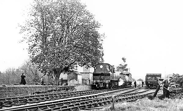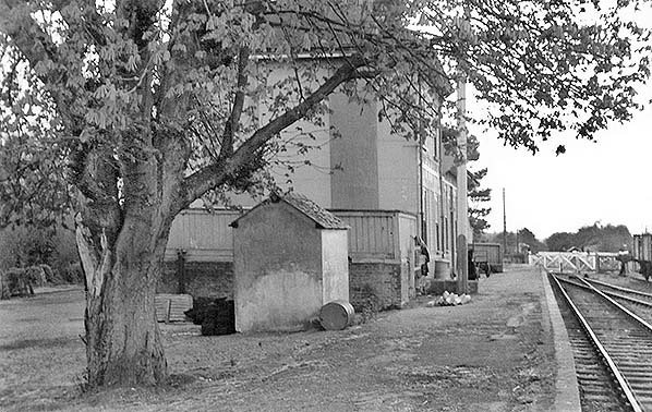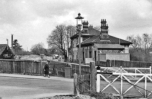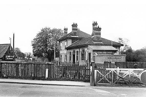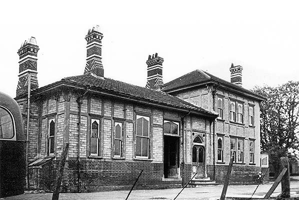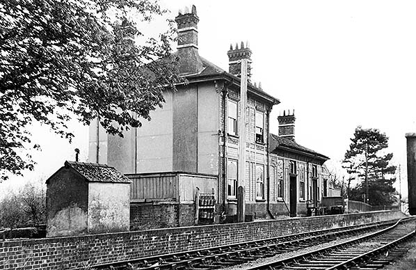 Photo by RM Casserley ![]() This is the only photograph so far found that shows the station after closure. This view was taken in May 1963, a year after closure but before the track was lifted. Apart from the removal of the Southern Railway enamel sign on the side wall of the gents' toilet little else appears to have changed. Two years later this would all change when the station was demolished prior to the construction of a roundabout on the site of the station with a new town bypass running along the length of the goods yard; this was completed in 1971. Coal Merchant A E Smith was able to stay in business and the 1971 OS map shows a coal yard on the west side of the new road junction; by 1983 the site is identified as a 'depot' .