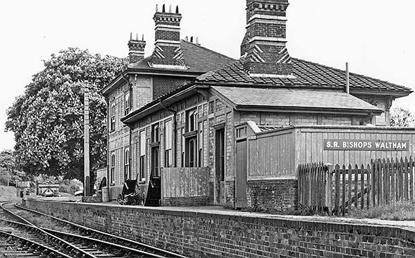 ![]() Bishops Waltham station forecourt of 27 April 1964, the last day of goods service. The two storey stationmaster's house is to the right with its entrance in the single-storey block. Presumably the porter who was in charge of the station lived here in later years. The booking office and waiting room on the left was converted into a goods and parcel office in the 1950s. Following the closure to passengers in 1932 the Southern Railway considered letting out the house to a member of the public, but eventually decided against it as they considered it might be difficult finding a tenant. The rear end of a Hants & Dorset bus can be seen on the left. Unfortunately not enough is visible for a positive identification but is it suspected of being one of H&D's Bristol 'L' types, some of which had locally built Portsmouth Aviation bodywork.