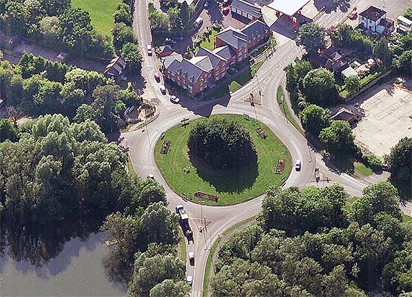 The site of Bishops Waltham station seen from the air. The level crossing gate seen above can just be made out to the left of the roundabout. Winchester Road runs from the top right, across the roundabout and into the right of Bishops Waltham Pond which is seen bottom left. The road running off top the right is Corhampton Lane which follows the course of the goods yard. The open ground to the right is the site of the coal yard. An aerial photo from 2014 shows that this is now housing.