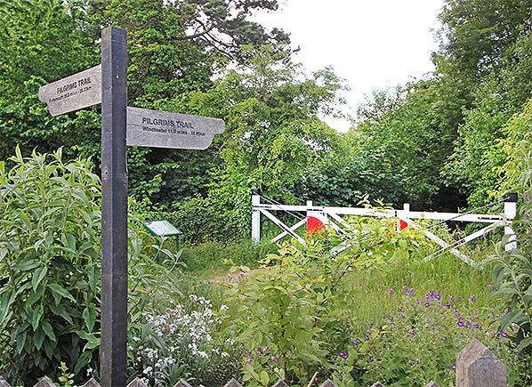 South of the Old Station Roundabout 300yd of the old trackbed has been retained as a public footpath and now forms part of the Pilgrims' Trail footpath which was created by the Bishops Waltham Society and now forms part of a 155-mile long-distance footpath that connects Winchester Cathedral to Mont St-Michel in Normandy.