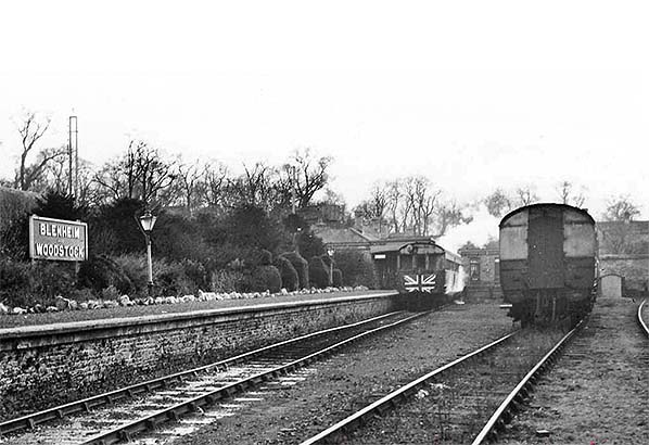 ![]() The GWR running in board at Blenheim and Woodstock remained in place until closure. Probably seen here on the last day.