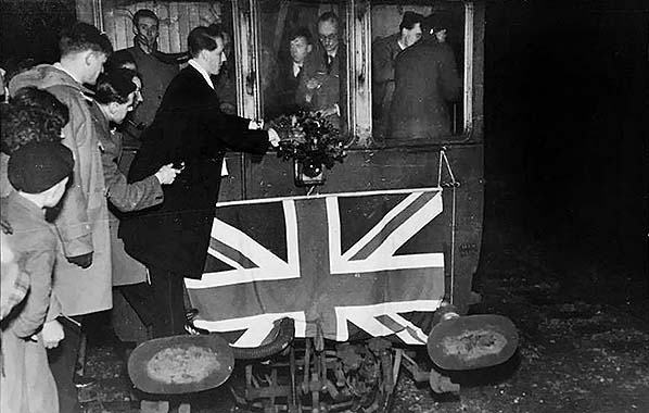 Photo from Michael Jordan collection ![]() This is one of several views of Woodstock taken after sunset on the final day and just prior to departure of the last train, the 7.15PM. The Union Flag had been attached earlier that afternoon but here we see a wreath being placed on the front of the autotrailer. Many of the people present were from the University of Oxford who seemingly outnumbered the local people who turned out for the occasion. The driving cab is also well populated and British Railways were remarkably tolerant of this sort of deluging when branch lines closed. Whether Driver Collins allowed people to remain in the cab during the final journey is another matter.
