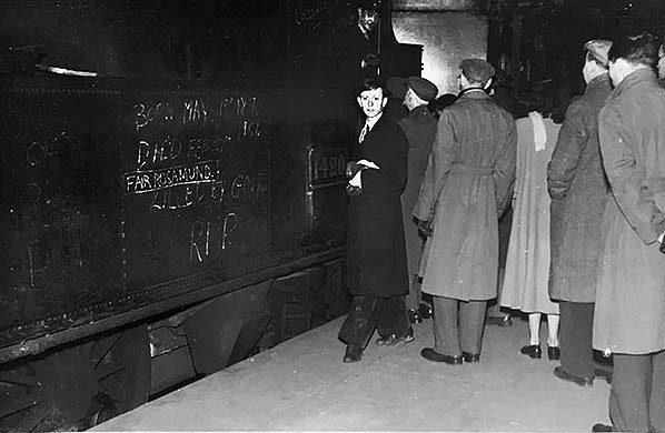 Photo from Michael Jordan collection ![]() A close up view of more of the scribblings on No. 1420 just prior to the final departure. Funereal comments such as "Born [and] Died" and "RIP" were pretty much the norm on these occasions as were anti Government remarks such as "Killed by Govt" as seen here. While Government was responsible for the 'pen to paper' aspect it was lack of usage which actually killed off branch lines. Nevertheless, while economies were applied to the Woodstock branch in 1926 the ratio between revenue and operating costs remained disproportionate and not helped by the majority of trains running only to/from Kidlington. A further economy, in later years at least, was the branch goods being operated as a mixed train, i.e. goods wagons attached to passenger trains, while shunting was often carried out with the autotrailer still attached. In 1949 an ex-GWR diesel railcar appeared on the branch. While operating the Woodstock branch the steam autotrain would disappear to the Thame branch before swapping over again later in the day. The use of the diesel railcar proved to be short lived and possibly because it was unsuited to hauling unbraked goods wagons. Whether the railcar created an increase in business is not recorded but its time on the Woodstock branch was probably too short to have made any real difference. Also on the side of No. 1420 has been chalked 'Fair Rosamund', the name of a 517 Class locomotive which had worked the branch for many years. The origin of the name is explained elsewhere.