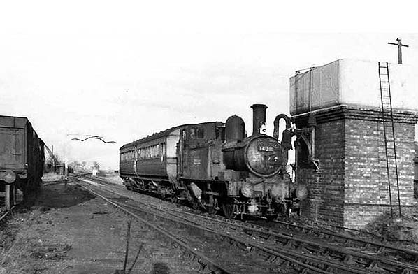 Photo from John Mann collection ![]() Another view taken on the final day, 27 February 1954. The autotrain has reversed out of the station to take on water and 0-4-2T No. 1420 has already received a number of chalked scribblings to mark the closure of the branch. Side tank locomotives had a balancing pipe connecting the two tanks, therefore it was only necessary for firemen to fill up via one tank. Woodstock's water tank originally had a capacity of 3,206 gallons at a depth of four feet. This tank was supplied by Messrs. Ransomes & Rapier. The tank is thought to have been replaced at some point in time but details are elusive. The brick tower had two windows in its rear and a doorway in its east end, the interior space being used for storage as was often the case. This part of the station site was also the location, until 1926, of the engine shed and signal box. There was a locomotive coaling stage near the east end of the engine shed which apparently also disappeared in 1926 and, perhaps obviously, this was also the year a locomotive ceased to be shedded at Woodstock. No evidence of a replacement coaling stage has been found so perhaps coaling when the branch train ran through to Oxford was deemed sufficient. However, the wheel tyre of the wagon on the left is not exactly highly polished, suggesting this wagon had been on the siding for some time which may in turn suggest provision for hand coaling was made. If so it would have been done via the goods shed road, which siding was closer to the wagons than that in the centre of the photograph. The siding on which the wagon stands ended, at this time, at a bufferstop just out of view to the left. Between the wagons and the autotrain can be seen Woodstock's goods loading gauge. It is over the siding which served the carriage dock, opposite the station platform. The gauge itself is of the type with hinged outer sections and is here seen set for the GWR loading gauge (this means clearances at bridges, tunnels and so on). The GWR loading gauge was more generous than that of other railways, or Regions following Nationalisation, and with the outer sections of the gauge lowered it then represented the LMS loading gauge. Thus any wagons with a load which fouled the goods yard gauge were deemed 'out of gauge' and were not permitted to travel until compliantly reloaded. The system was simple and effective. As will be realised, the term 'loading gauge' has two meanings, firstly the measuring device as seen here and secondly, clearances along the lines although of course the two are inextricably linked.