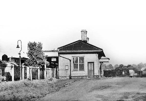 Brasted station and forecourt with a push-and-pull train at the platform. The date is unknown but is probably shortly before closure. To the immediate right of the building the grounded van body can just be seen while further to the right what appears to be a Lambretta or Vespa is parked, types of scooters of Italian origin popular in Britain from the 1950s. They became synonymous with 'Mods' during the period of the 'Mods and Rockers' youth subcultures of the time.