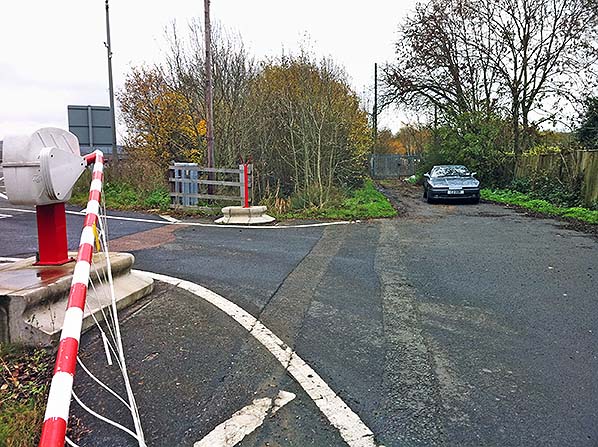 Looking east from the summit of Brasted station approach road in 2013. The station was directly ahead and the goods yard in the right background. The former stationmaster's house is out of view to the right. The road on the left complete with damaged (correction, wrecked) barrier is emergency and contractors’ access to and from the clockwise carriageway of the M25 which is to the immediate left. Another sign of the times at this location is a mobile phone mast, out if view behind the trees ahead of the camera.