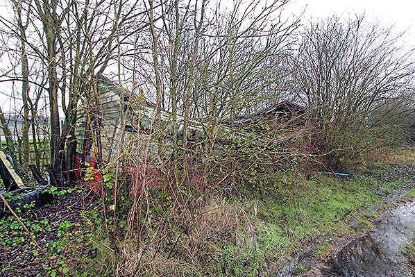 A hut, which has seen rather better days, in the former Brasted goods yard in January 2016. The hut is old but may have been re-erected on the goods yard site long after the railway closed. The M25 motorway can just be glimpsed on the far left.