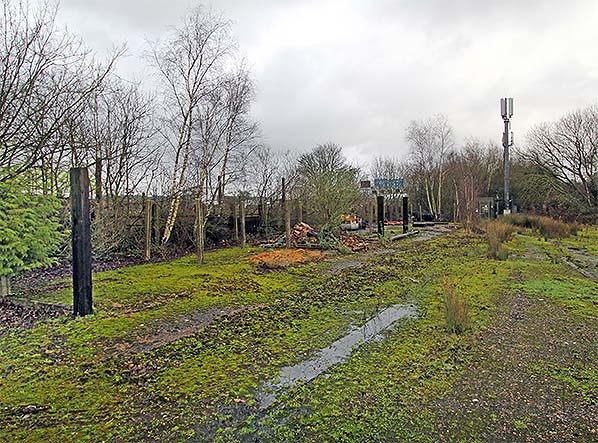 Looking east at the east end of Brasted goods yard in January 2016. The timber posts are the remains of the post-railway coal bins. The original bins were behind the photographer. The M25 is behind the trees on the left.