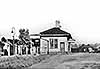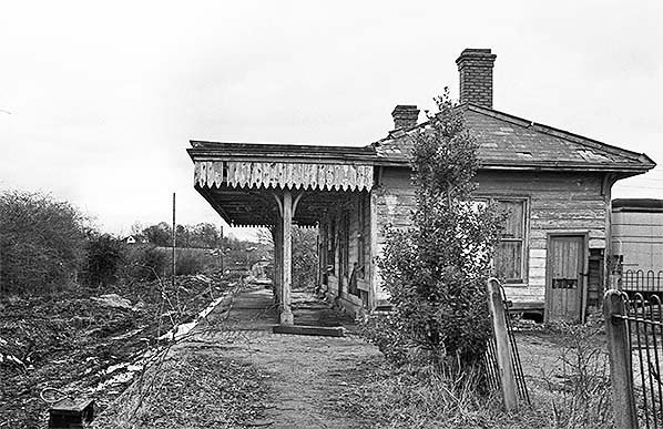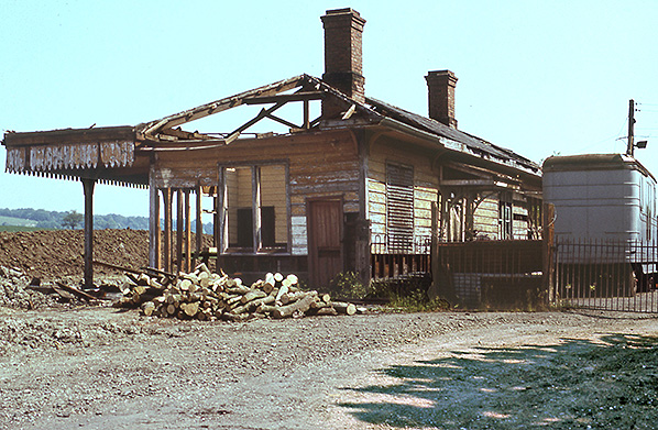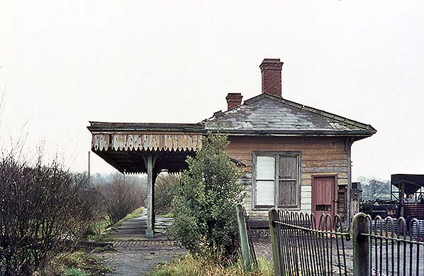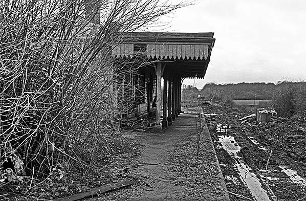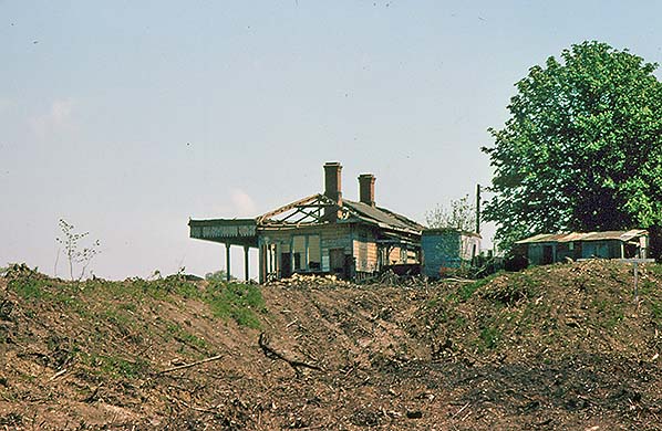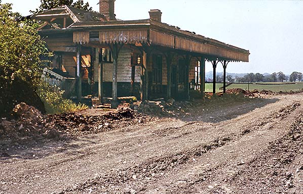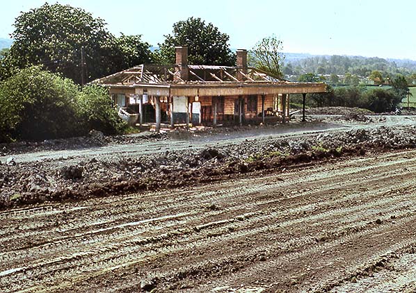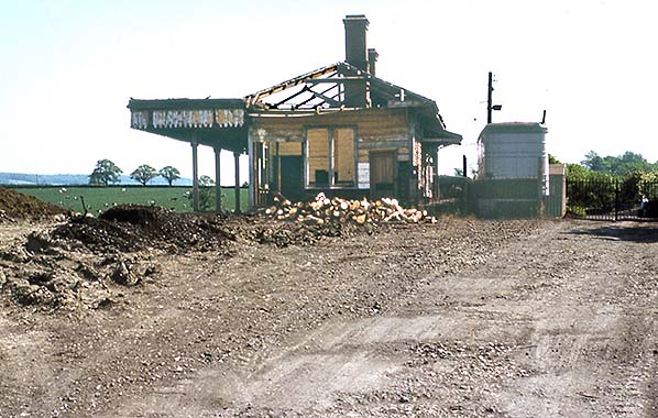 Photo by Nick Catford ![]() A further view of the station building from the approach road, also during the spring of 1977. A degree of caution is advised with these 1977 images. It is easy to assume that the building is in the process of being demolished, especially given the pile of debris ahead of the camera, but in all probability the building is simply falling apart on its own, perhaps aided by vibrations from contractor’s plant. Close examination of the remains of the roof around the nearest chimney shows what looks like evidence of fire damage. If so, the fire must have been small as the basic fabric of the largely wooden building is still intact. In any event, bulldozers ultimately removed all traces of the station the following year.
