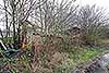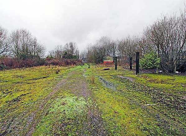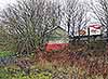 Looking south-west through the site of Brasted goods yard in January 2016. The station was in the right background, beyond the hut. The M25 is behind the trees on the right. The timber posts on the right are the remains of a later set of coal bins built some years after the station closed. The original bins were where the wooden building is now seen. The building is something of a mystery. It is now in much worse condition than in the 2013 picture above and will probably soon collapse. It appears to be an old building but is likely to have been re-erected here at some time after closure of the railway. It does not appear on any large scale maps up to 1985 so might post-date the coal yard at this site. After the coal merchant left, the site was used to store vintage cars for some time.