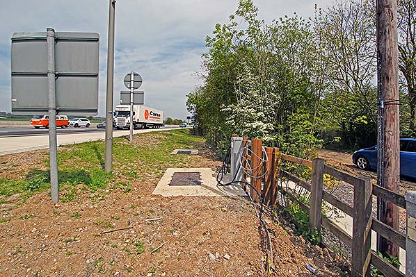 ![]() The site of Brasted station looking east in April 2014 with the M25 on the left. The building would have been where the dense clump of trees stands, with the motorway hard shoulder occupying the former trackbed. The top of the station approach road would have been where the car stands on the right, the Ford Squire seen in the 28 October 1961 view of the station forecourt having long since disappeared.