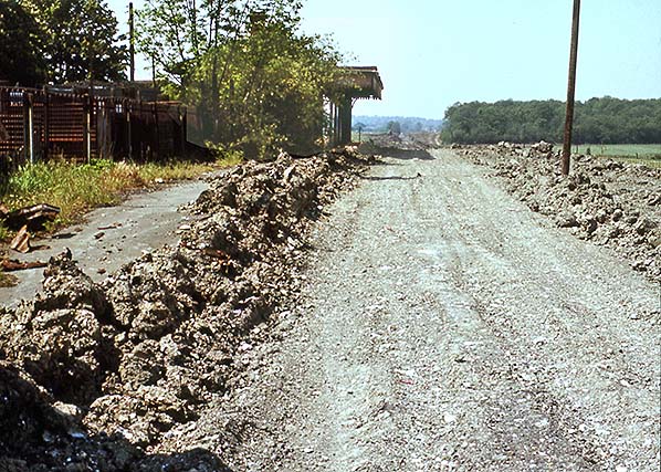 ![]() Brasted looking towards Westerham in spring 1977, viewed from the contractor’s access road. Evidence of tracked vehicles, bulldozers etc., can be seen on the ground, as can evidence of off-road vehicle tyres. On the left, part of the platform and what appears to be the ramp can be seen and, at this point, still slightly above ground level. In the left background the two posts which might initially be assumed to be those that once supported the running-in board appear, under magnification, to be of some other origin; in any case, they look to be too far back to have been connected with the running-in board. The pole on the right may be the remains of the telegraph pole visible in several earlier images. It must have still been in use for one purpose or another when the photograph was taken, otherwise it would have been removed.
