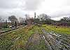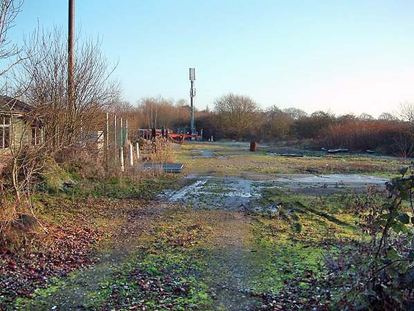 Looking north-east across the site of Brasted goods yard sometime in 2013. The station was to the left, but the wooden building visible on the left was probably not of railway origin and does not appear on any large scale maps. The mast in the background tells us the site is still used for communications but of an entirely different kind to trains. The remains of coal bins can be seen on the left in front of the phone mast. These are later bins; the original goods yard bins were roughly where the wooden hut is now seen. The small goods dock was on the right. The small goods dock was on the right.