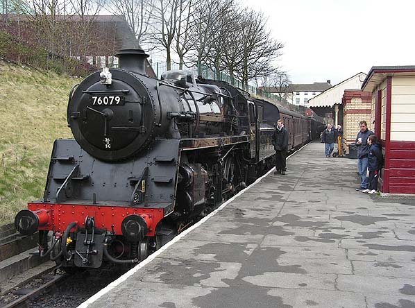 ![]() Looking north along platform 4 at Bury Bolton Street station in March 2008. A BR Standard type 4 locomotive had just arived from Rawtenstall on route to Heywood. Photo by Paul Wright