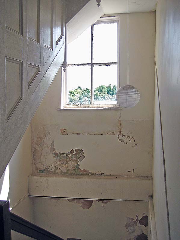 ![]() Station Name: CIRENCESTER TOWN[Source:Peter Stephenson] ![]() Looking south from the first floor to the main staircase in May 2016. The boxed staircase to the top floor can be seen to the left. The main stairs lead down to ground level. The window is the one visible in views of the station from the south. The photo shows that the lower part of the window was blocked. This probably dates from when the platform awning was installed, as that partly blocked the window. The horizontal ‘box’ on the wall below the window probably contains what is left of one of the girders fitted through the building c1920 to support the extended platform awning.