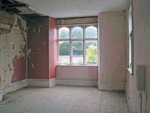 A view of the main first floor room looking north out through the bay window and across Tetbury Road in May 2016.