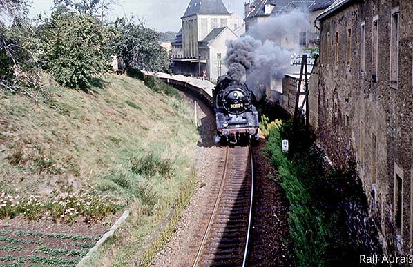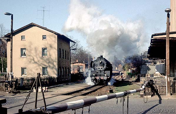 ![]() Station Name: COLDITZ![]() In the summer of 1987 Deutsche Reichsbahn Class 50 2-10-0 No. 50 3673 struggles away from Bahnhof Colditz with a heavy sand train heading north towards Großbothen. The train has just passed Colditz W1 stellwerk (signal box) and is negotiating the level crossing adjacent to the former and quite distinctive warehouse building on Bahnhofstrasse. Using preserved steam locomotives, this scene could still be witnessed on special occasions up until the Muldentalbahn was truncated at Colditz in 1999. Note the kilometer post on the right, the distance being measured from the junction with the Dresden line just east of Glauchau (Sachs). The plot of land at bottom left was apparently used by a local resident for growing fruit and vegetables. Photo by Ralf Auruß ![]() In January 1987 Deutsche Reichsbahn Class 50 2-10-0 No. 50 3673-6 heads a sand train for Glauchau. She has just passed Stellwerk Colditz W1 (signal box) and is about to negotiate Bundestrasse level crossing. The building on the left is shown on plans as "Wohngeb", meaning a residential property. It no longer exists and today the pavement has been extended over the track. As of 2022 the crossing barriers remained in rather dilapidated condition and partly hidden by foliage. No. 50 3673-6 was built by Borsig in 1941 as Reichsbahn No. 50 1347. She was rebuilt in 1961 and renumbered 50 3673, later becoming 50 3673-6. She was withdrawn in 1991 and eventually found her way to the Museo Ferroviario del Verbano, 21016 Luino, Varese, Italy and is maintained in operational condition. A total of 3,160 members of Class 50 were built.