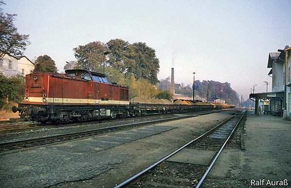 Photo by Ralf Auruß ![]() In November 1991 Class 112 B-B diesel hydraulic No. 112 687-3 stands at Colditz with a loaded sand train. The locomotive number is barely readable but fortunately the photographer noted it and the locomotive is devoid of Deutsche Reichsbahn markings. The latter company formally merged with Deutsche Bundesbahn, the former West German organisation, on I January 1994 to create Deustche Bahn AG (AG = Aktiengesellschaft, meaning a shareholder-owned company, the shareholder in this case being the German Government). These locomotives are perhaps best known to enthusiasts outside Germany as the V100 Class. Built for goods working, light passenger working and heavy shunting there were numerous sub types with different power ratings and different class numbers in, mostly, the 100 and 200 number series. They were, in respect of power, comparable to the British Railways Type 1 and Type 2 diesel locomotives. Most, if not all, were fitted with steam generators for heating passenger trains. As of 2024 some remain in service with private companies, locomotive hire outfits and so on while others have retired to museums. Interestingly there was a plan to convert thirty examples for use on the one metre gauge HSB system (Harzer Schmalspurbahnen - the Harz Mountain Railway system) with the intention of replacing steam in normal service. This did not happen and only ten locomotives were converted and in 2024 only three remained, now used for shunting, works trains, snowplough duties etc. Their appearance on the narrow gauge, especially when seen towering above narrow gauge rolling stock, is a sight for the eyes to behold. HSB staff gave them the nickname "Harzkamel" (Harz Camel), apparently not because of their appearance but because of their tendency to mimic the motion of a camel. Happily the HSB system, which was once owned by the Reichsbahn, retains steam operation but alongside a fleet of modern diesel railcars. ![]() Colditz station looking south from the island platform in Aoril 1992. Passenegers are using one of the two boarded crossings to reach the platform. Although described as an island platform trains only used the face out of view to the right.