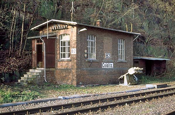 Photo by M Meyer ![]() Stellwerk Colditz B2 (Colditz command signal box) seen here when still operational in November 1999. German mechanical signalling is different to that in Britain where cables are used for signals and rodding for points. Germany uses a twin cable system for both. The weighted device seen here outside the signal box is a cable tensioner. At the opposite end to the weights, which are adjjustable, are pulleys which carry the cables for the frame inside the signal box. In this case cables are then carried in the conduit parallel to the track. Individual tensioners can also be found alongside the track, remote from signal boxes.