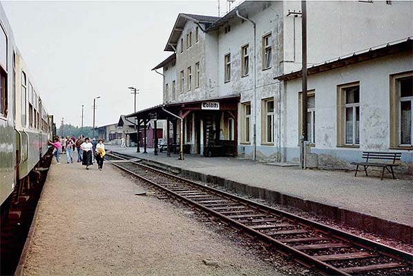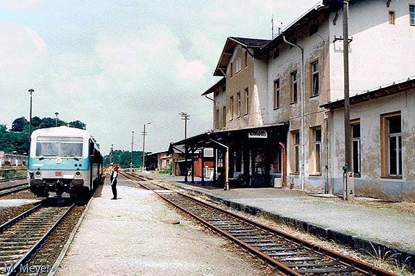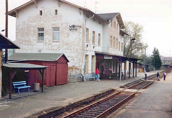 Photo by Mike Wood ![]() Passengers boarding a train at Colditz station in July 1992. Passengers reached the island platform by using the boarded crossing opposite the entrance. There appears to be no platform edge on the right side of the island platform suggesting only the left face was in use at this time.