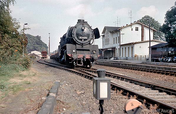 Photo by Ralf Auruß ![]() In September 1987 Deutsche Reichsbahn Class 50 No. 503551-4 stands opposite Bahnhof Colditz with the midday sand train for Glauchau with more wagons at the loading ramp (platform) in the left background. Usually locomotive numbers had either a space or a dot between the class number and locomotive number but there were exceptions and particularly where higher numbed locomotives were concerned, with No. 503551-4 being an example. This locomotive was new to traffic in June 1942 as No. 50 2669, becoming 50 3551 in February 1959 and 50 3551-4 in June 1970. She was withdrawn in April and sent to the Reichsbahn shops at Meiningen for conversion into a static boiler, presumably for carriage heating purposes. She was scrapped at Meiningen in April 1992. It is worth mentioning that Class 50 was an Einheitsdampflokomotive or Einheitslok in short, meaning 'Standard Steam Locomotive'. The famous Kriegslokomotive, or Kriegslok in short, meaning ''War Locomotive' was the Reichsbahn Class 52, the equivalent of the British Austerity locomotives and the USATC S160. The Reichsbahn Class 52 was, however, an altogether better machine and a few examples remain, in 2024, in service in Bosnia while others remain operational in preservation. A total of 7,794 members of Class 52 were built. On the station to the right can be seen the moped shed, the mopeds no doubt belonging to commuters. We must remember that 1987 was, just, still in the era of the Deutsche Demokratische Republik (German Democratic Republic).