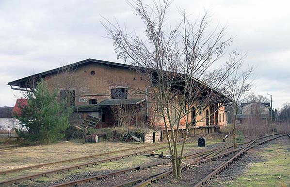Photo by Ralf Auruß ![]() Colditz goods shed in January 2005, the station is seen in the distance. The goods yard and shed closed on 27 May 2000 but since 6 November 1999 there was only access to the yard from the south with arriving and departing trains using the crossover on the right.