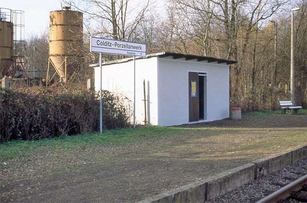 Photo by Ralf Auruß ![]() Colditz was well known for its porcelain industry. In 1804 a ceramics factory was established in Colditz by Thomsberger & Hermann but large scale production did not commence until 1948 when the communist authorities established VEB Porzellanwerk Colditz. In 1969 this became VEB Porzellankombinat Colditz and remained so until closure. This was the factory served by the halt seen here in November 1999 shortly before closure of the railway. Among the factory's customers was the Mitropa organisation who operated railway catering and sleeping car services predominantly in Germany. Mitropa began in 1916 as Mitteleuropäische Schlafwagen- und Speisewagen Aktiengesellschaft, (Central European Sleeping and Dining Cars Incorporated). Mitropa is simply a conveniently shortened trading name version of 'Mitteleuropa' or 'Central Europe'. Mitropa ceased to exist following 2002 when onboard catering was taken over by DB Fernverkehr AG, an offshoot of Deutsche Bahn AG. What then remained of Mitropa was taken over by British companies Compass Group in 2004 and Select Service Partner in 2006. The reunification of Germany ultimately brought an end to the porcelain industry at Colditz and the site of the factory is now occupied by a fabric company, a Deustche Post depot and other businesses. The overgrown platform is extant.