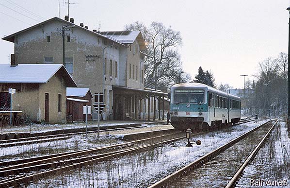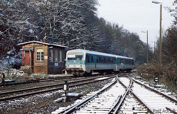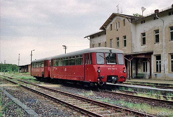 Photo by Frieda Fischer ![]() Unlike in Britain where the British Railways diesel railbuses of the 1950s can only be described as a short-lived embarrassment, Germany made good use if her 4-wheeled railbuses and obtained decades of good service out of them, in part because they could tow trailers and in many cases be coupled in multiple to form trains of up to five vehicles. They were also quite popular with passengers. Seen here at Colditz, this is described by the photographer as the last scheduled service into Colditz in May 2000; a pair of what began life as Deutsche Reichsbahn Class VT 2.09. Developed by VEB Waggonbau Bautzen in 1955 they appeared from 1959 onwards and remained in operation into the 21st century. Control trailers appeared from 1965 and driving controls were fitted at one end only. There was no separate driving compartment originally, drivers being in among the passengers as it were, but in later years some at least were given segregated driving compartments. The concept was very similar to the perhaps more familiar, to people outside Germany, Uerdingen railbuses of the former Deutsche Bundesbahn, being the vehicles which British Railways Waggon und Maschinenbau railbuses E79960 - 4 were based upon. In this view control trailer 972 748 is nearest the camera, the other vehicle being motor car 772 148. The latter car was reputedly the final example to wear the red livery. Deutsche Bahn withdrew the final examples from regular service in 2004 although a number survive for special duties, engineering work etc. and on private railways. Some went to Usedomer Baderbahn, on the island of Usedom, and were still there in 2018 but believed out of use. Usedom is of course the location of the Peenemunde establishment where Hitler's V1 flying bomb and V2 rocket were developed.