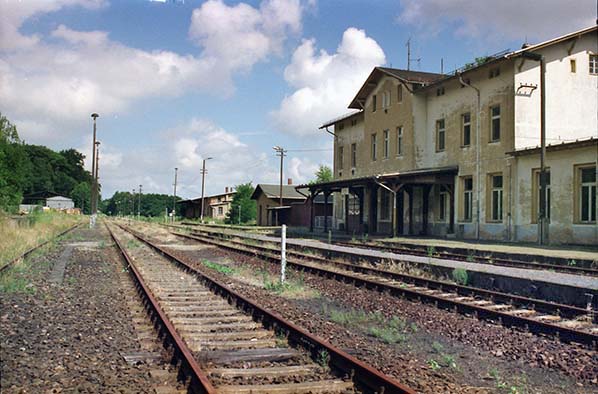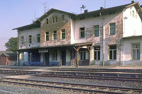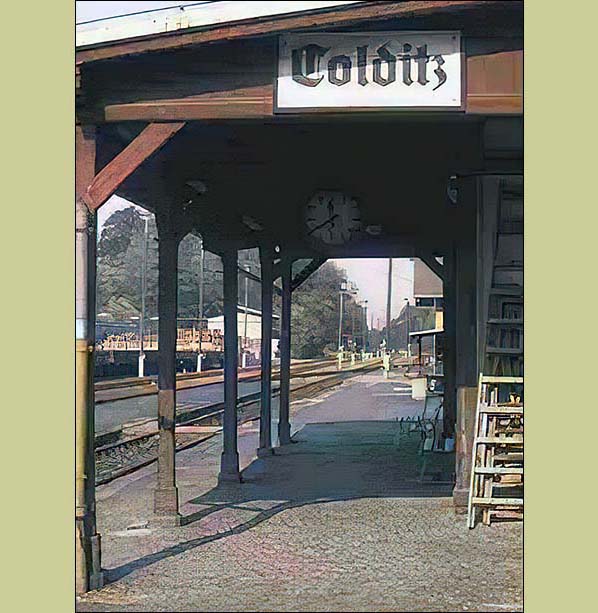 Photo by Frieda Fischer ![]() Colditz station looking south c late 1990s. The station name suspended beneath the platform awning is in the rather delightful Gothic font once so familiar in Germany.