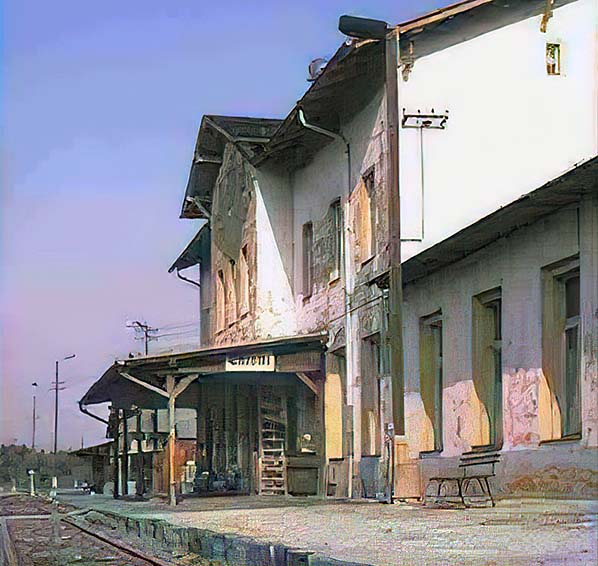 ![]() Looking north at the station building c. late 1990s. The building is looking dilapidated and the track is very rusty, from photographic evidence this line was taken out of use before closure of the station with all trains running into the west face of the island platform. The canopy in front of the goods shed can just be made out in the distance.