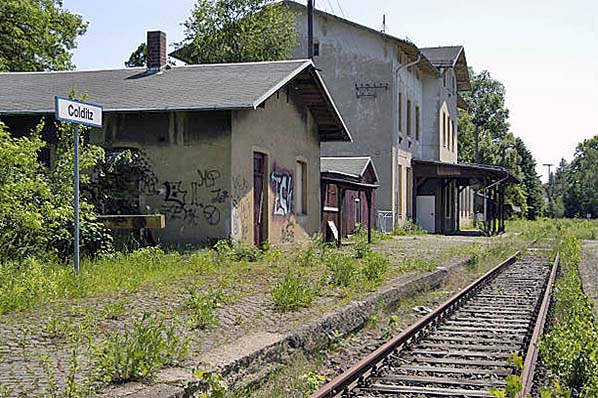 Photo by Thomas Stranz ![]() Colditz station looking south a few years after closure. Vegitation is gradually taking over the track and platform but station signs are still in place.