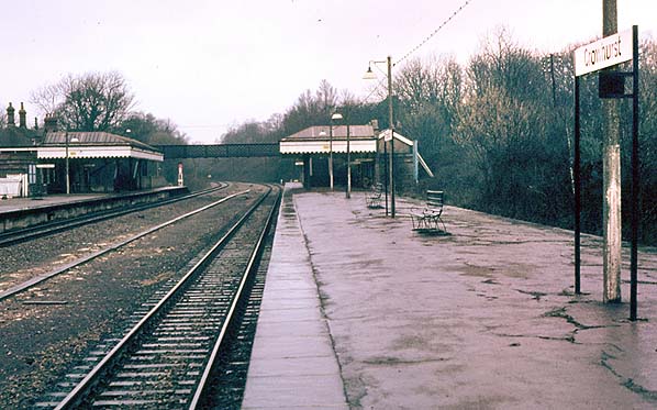 Crowhurst station looking north-west from the down main line platform in March 1978. Undergrowth has started taking over the bay line on the right.