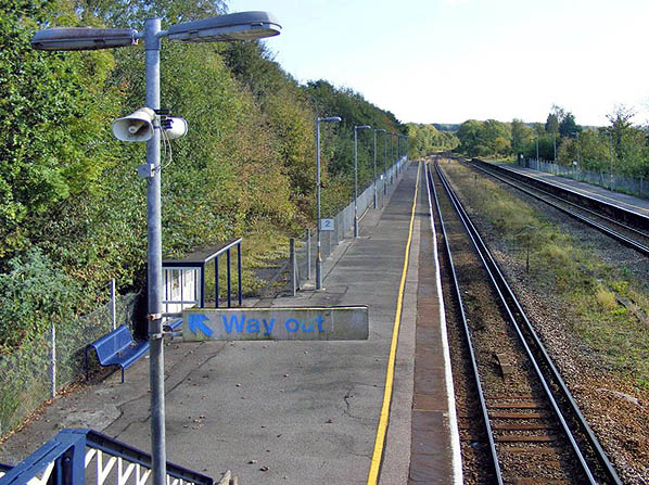 station looking south-east along the down platform from the station footbridge in October 2007. The station building at the bottom of the steps has been replaced with a bus shelter