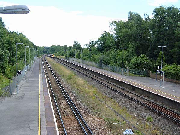 Crowhurst station looking south-east from the station footbridge in July 2008. A class 375 'Electrostar' EMU is approaching the station. Photo by Alan Young