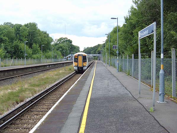 A Class 375 'Electrostar' EMU bound for Hastings waits at the down platform at Crowhurst station in July 2008. The down bay line is behind the fence. The nameboard is in SouthEastern livery. Photo by Alan Young