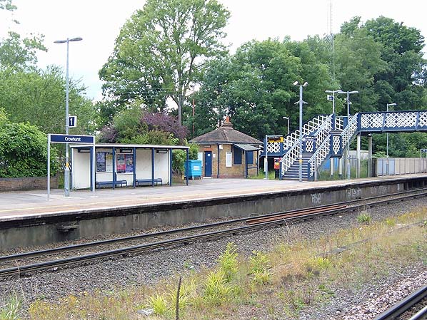 Crowhurst station up platform in July 2008. This view shows the site of the main station building which was demolished in 1985. The new buildings consist of the former lamp room (right) which is now the ticket office and a long bus shelter. The nameboard is in SouthEastern livery.